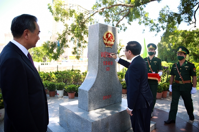 Phó Thủ tướng, Bộ trưởng Ngoại giao Phạm Bình Minh và Ủy viên Quốc vụ, Bộ trưởng Ngoại giao Trung Quốc Vương Nghị bên cột mốc biên giới. Ảnh: VGP/Hải Minh