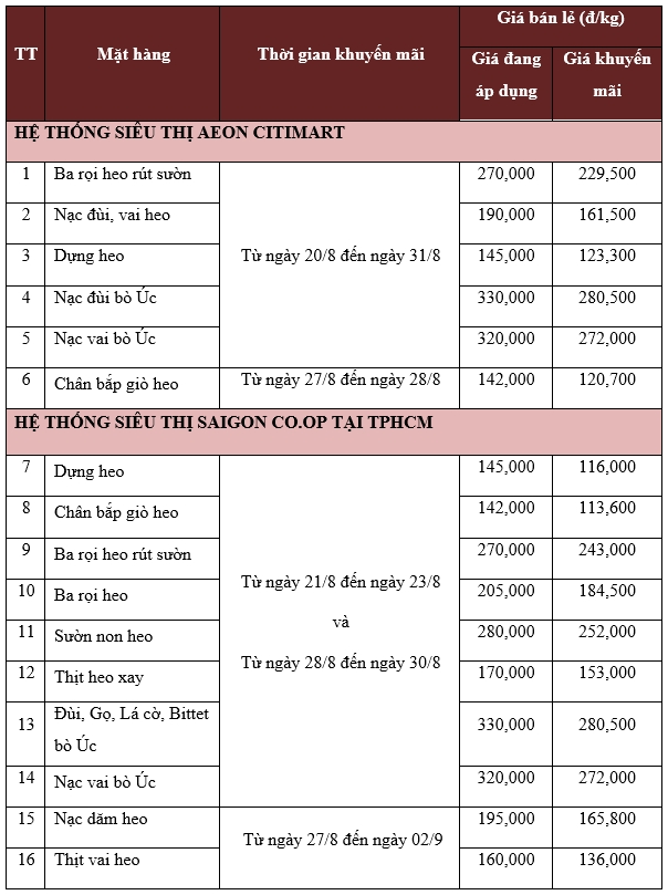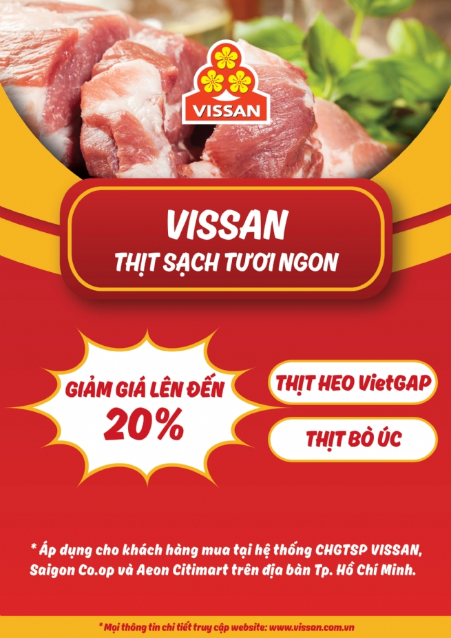 Nhằm chia sẻ khó khăn với người tiêu dùng trong bối cảnh dịch Covid-19 diễn biến phức tạp, Công ty Cổ phần Việt Nam Kỹ Nghệ Súc Sản Vissan triển khai chương trình giảm giá lên đến 20% các mặt hàng thịt heo VietGAP và thịt bò Úc tại hệ thống siêu thị Saigon Co.op và Aeon Citimart.