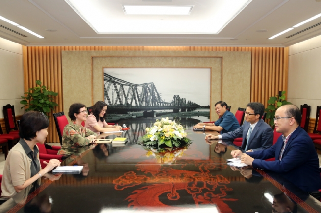 Phó Thủ tướng Vũ Đức Đam tiếp bà Marie-Odile Emond, Giám đốc quốc gia UNAIDS tại Việt Nam, chiều 3/9. Ảnh: VGP/Đình Nam