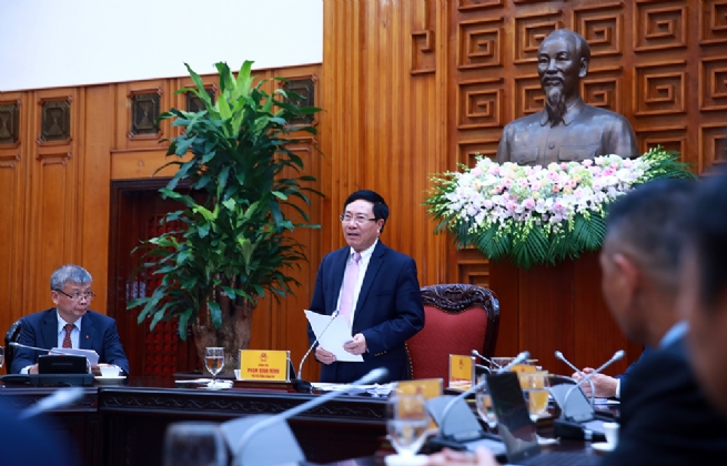 Phát biểu tại buổi làm việc, Phó Thủ tướng Phạm Bình Minh khẳng định trong bối cảnh kinh tế toàn cậu sụt giảm chưa từng có trong lịch sử gần đây, việc nước ta kiểm soát được dịch COVID-19 và đạt mức tăng trưởng dương (2,12% trong 9 tháng đầu năm) là tín hiệu đáng mừng, nhờ quyết tâm cao, sự chỉ đạo điều hành linh hoạt của Chính phủ và sự nỗ lực, đồng hành của cộng đồng DN.