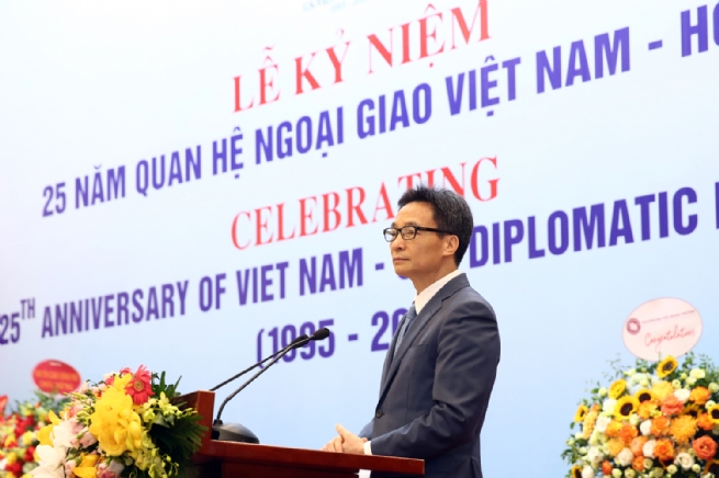 Phát biểu tại buổi lễ, Phó Thủ tướng Vũ Đức Đam nhấn mạnh, việc bình thường hóa quan hệ ngoại giao giữa Việt Nam và Hoa Kỳ là một quyết định quan trọng của lãnh đạo cấp cao hai nước, khép lại một thời kỳ khó khăn và mở ra giai đoạn mới đầy hứa hẹn. Quan hệ Đối tác toàn diện Việt Nam - Hoa Kỳ ngày càng phát triển sâu rộng và thực chất, từ chính trị - ngoại giao, kinh tế - thương mại, quốc phòng - an ninh đến khoa học-công nghệ, y tế, giáo dục…Thương mại song phương tăng gấp 170 lần kể từ năm 1995, đạt gần 80 tỷ USD. Giao lưu nhân dân giữa hai nước ngày càng nhộn nhịp với hàng triệu lượt người qua lại du lịch, thăm hỏi hàng năm.