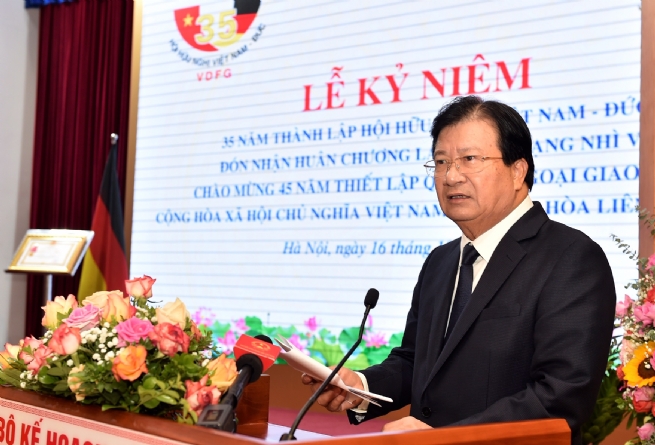 Sáng nay (16/10), Hội Hữu nghị Việt Nam-Đức tổ chức lễ kỷ niệm 35 năm thành lập, đón nhận Huân chương Lao động hạng Nhì và chào mừng 45 năm thiết lập quan hệ ngoại giao giữa Việt Nam và Đức. Phó Thủ tướng Trịnh Đình Dũng, Bộ trưởng Bộ Kế hoạch và Đầu tư, Chủ tịch Hội Hữu nghị Việt Nam-Đức Nguyễn Chí Dũng và Đại sứ đặc mệnh toàn quyền CHLB Đức tại Việt Nam Guido Hildner dự buổi lễ.