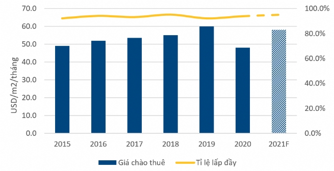 Qúy 4/2020, giá thuê mặt bằng trong nước tiếp đà giảm. Đáng chú ý, giá thuê đã giảm trung bình 10 USD so với mức giá cùng kỳ năm 2019. Mặc dù vậy, tỷ lệ lấp đầy lại vẫn tiếp tục duy trì ở mức khá tốt, thậm chí còn cao hơn 1% so với cùng kỳ năm 2019.