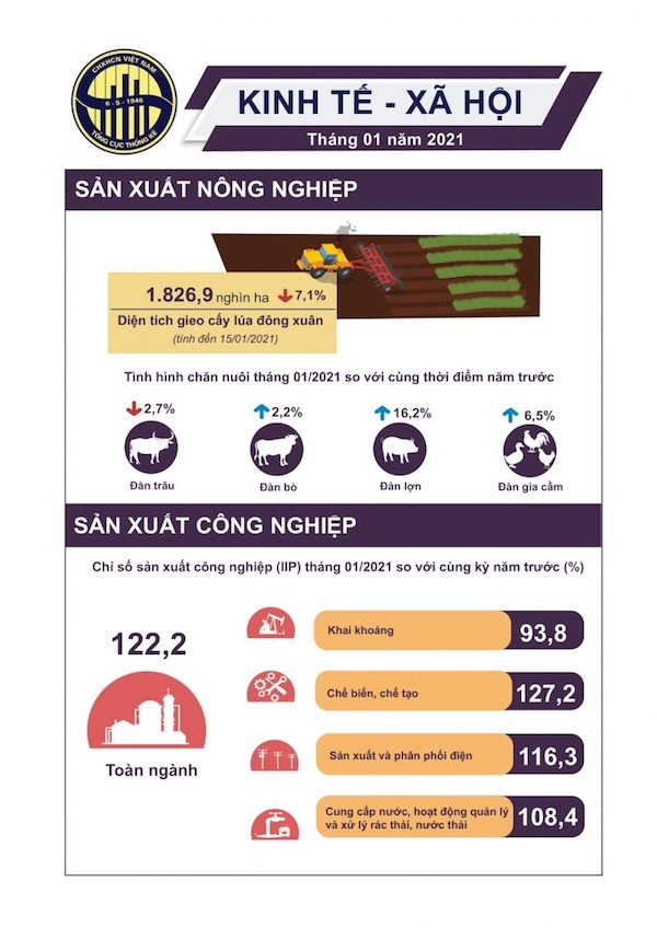 Cũng theo Bộ trưởng, chỉ số sản xuất công nghiệp tăng cao so với cùng kỳ năm 2020, tuy nhiên giảm 3,2% so với tháng 12/2020; trong đó, ngành công nghiệp chế biến, chế tạo giảm 3,1%. Nguyên nhân có thể do chu kỳ kinh doanh, khi doanh nghiệp thường có xu hướng đẩy mạnh sản xuất trong các tháng cuối năm và tập trung tiêu thụ trong tháng 1. Tuy nhiên cần tiếp tục theo dõi sát sao để đề xuất chính sách hỗ trợ phù hợp nếu xu hướng này tiếp tục kéo dài.