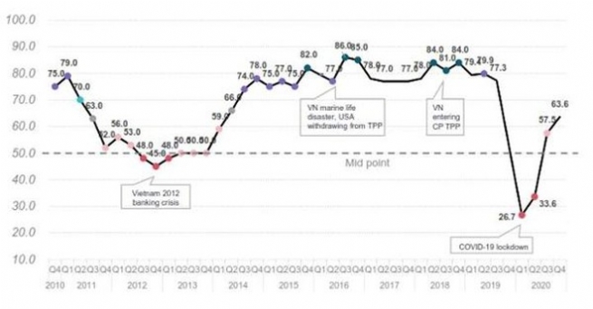 Cụ thể, BCI tăng 6 điểm trong quý IV/ 2020, đạt 63,6 điểm phần trăm khi kết thúc năm 2020 với kết quả cao. Tổng cộng, chỉ số này đã tăng 37 điểm kể từ năm ngoái, sau khi ghi nhận mức điểm thấp kỷ lục trong quý I/2021 với sự bùng phát dịch COVID-19 lần thứ nhất.