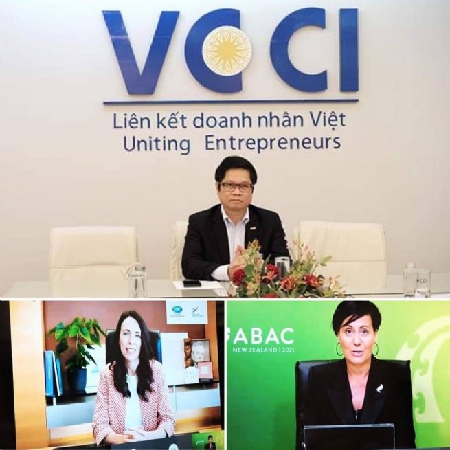 Chủ tịch VCC TS. Vũ Tiến Lộc tham gia cuộc họp trực tuyến cùng Thủ tướng New Zealand bà Jacinda Ardern (trái) và bà Rachel Taulelei Chủ tịch ABAC 2021