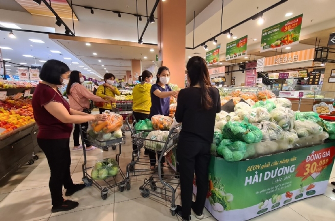 Nhằm hỗ trợ nông dân Hải Dương tiêu thụ nông sản ảnh hưởng nặng nề do dịch COVID-19, từ ngày 25 – 28/2/2021, AEON Việt Nam bày bán các sản phẩm nông sản Hải Dương với mức giá ưu đãi không lợi nhuận tại tất cả các địa điểm kinh doanh của doanh nghiệp này ở Hà Nội, dự kiến đạt 43 tấn sau 4 ngày “giải cứu”.