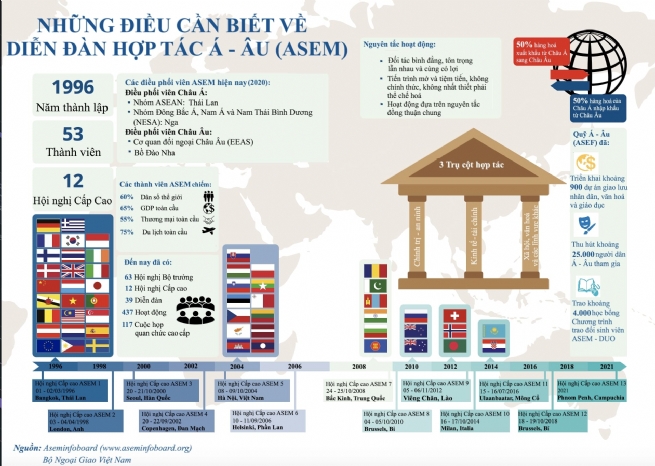 Kể từ khi chính thức thành lập ngày 1/3/1996, Diễn đàn Hợp tác Á-Âu (ASEM) đã trở thành cơ chế hợp tác liên khu vực có quy mô lớn nhất thế giới, với sự tham gia của 53 thành viên từ hai châu lục Á-Âu. ASEM đã khẳng định vai trò quan trọng đối với hòa bình, an ninh, ổn định và phát triển thịnh vượng tại hai châu lục, đóng góp thiết thực định hình những xu thế lớn và cục diện thế giới trong thế kỷ 21.