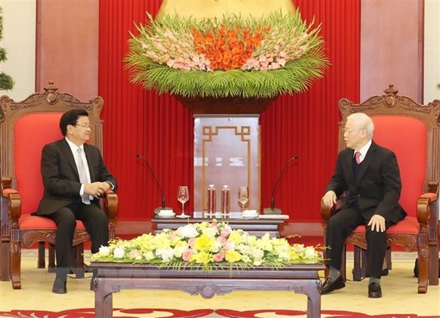 Tổng Bí thư, Chủ tịch nước Nguyễn Phú Trọng tiếp Tổng Bí thư, Thủ tướng Lào Thongloun Sisoulith nhân dịp sang Việt Nam dự Kỳ họp lần thứ 43 Ủy ban liên Chính phủ Việt - Lào về hợp tác song phương tháng 12/2020. Ảnh TTXVN