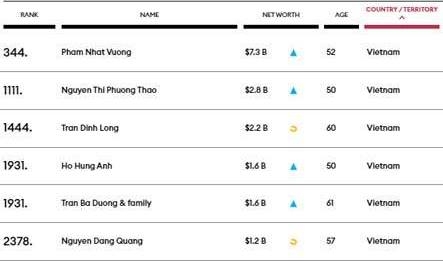 Danh sách các tỷ phú USD của Việt Nam với tổng tài sản và vị trí trên xếp hạng toàn cầu