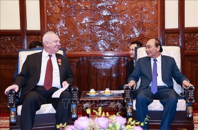 Chủ tịch nước Nguyễn Xuân Phúc khẳng định Việt Nam luôn trân trọng quan hệ hữu nghị truyền thống và gắn bó giữa hai dân tộc, vui mừng trước sự phát triển tích cực của quan hệ Đối tác chiến lược toàn diện giữa Việt Nam và Nga thời gian qua. Chủ tịch nước hoan nghênh việc hai nước duy trì thường xuyên tiếp xúc các cấp, đặc biệt là cấp cao, cũng như đánh giá cao kết quả điện đàm vừa qua giữa Tổng Bí thư Nguyễn Phú Trọng và Tổng thống Nga Putin, góp phần quan trọng thúc đẩy hợp tác giữa hai nước trên các lĩnh vực, tương xứng với mối quan hệ Đối tác chiến lược toàn diện giữa Việt Nam và Nga.