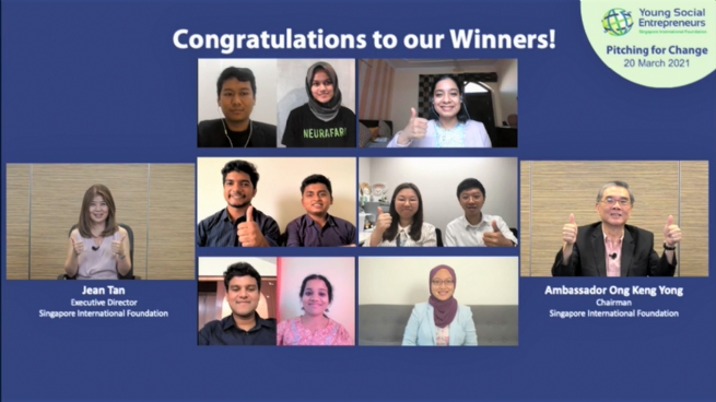 Sáu đội giành chiến thắng tại vòng chung kết YSE Global 2020, cùng Chủ tịch SIF, Ngài Đại sứ Ong Keng Yong và Giám đốc SIF, Bà Jean Tan. (Nguồn ảnh: SIF)