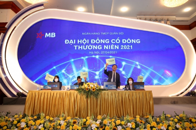 Sáng 27/4/2021, Đại hội đồng cổ đông thường niên 2021 của Ngân hàng TMCP Quân Đội (MB) được tổ chức . Dự Đại hội có đại diện lãnh đạo Bộ Quốc phòng, Ngân hàng Nhà nước Việt Nam, Ngân hàng Nhà nước Việt Nam - chi nhánh Hà Nội, Ủy ban Chứng khoán nhà nước, Trung tâm lưu ký chứng khoán, Bộ Kế hoạch Đầu tư và 824 cổ đông, chiếm 69,25% tổng số cổ phần có quyền biểu quyết của MB.