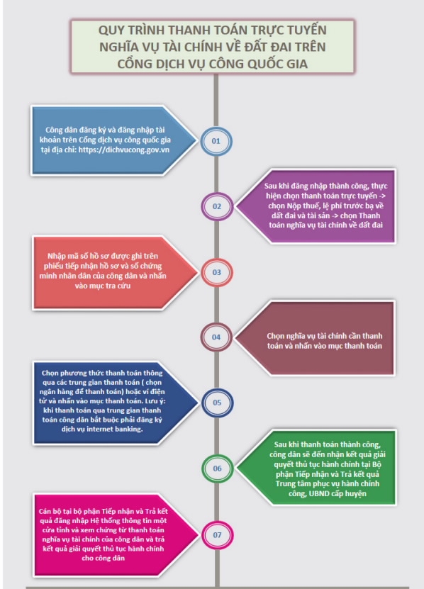 Quy trình thực hiện sau khi được đơn giản hóa như sau: Ngay sau khi sau Cơ quan Thuế xác định mức của các loại nghĩa vụ tài chính về đất đai phải nộp, Cổng dịch vụ công tỉnh sẽ gửi tin nhắn thông báo đến điện thoại cá nhân, người dân truy cập vào Cổng dịch vụ công quốc gia (tại địa chỉ https://dichvucong.gov.vn/p/home/dvc-thanh-toan-thue-dat-dai.html) để tra cứu theo mã hồ sơ ghi trên phiếu tiếp nhận và hẹn trả kết quả, ghi số chứng minh nhân dân hoặc căn cước công dân để tra cứu nghĩa vụ và thực hiện nộp trực tuyến qua ngân hàng thương mại hoặc các tổ chức cung ứng dịch vụ trung gian thanh toán.