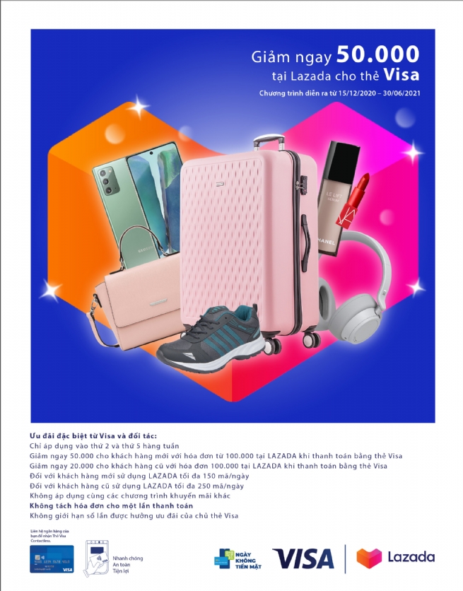 Chủ thẻ Visa khi thực hiện giao dịch thanh toán trực tuyến trên các trang thương mại điện tử Lazada, Shopee, Tiki, Now hoặc thanh toán trực tuyến thông qua ví Moca trên ứng dụng Grab sẽ hưởng mức giảm giá lên đến 50.000 đồng. Các ưu đãi và hoàn tiền hấp dẫn khác áp dụng cho Agoda, Booking.com và thương hiệu thời trang cao cấp hàng đầu như Net-a-Porter và Farfetch. Chủ thẻ Visa còn được tặng voucher, ưu đãi giảm giá khi thanh toán không tiếp xúc tại chuỗi bán lẻ trà – cà phê Phúc Long, rạp chiếu phim CGV và dịch vụ taxi Mai Linh*.