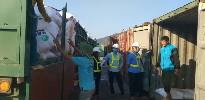 Xếp dỡ phân bón từ xe tải vào container tại cảng quốc tế Lào Việt