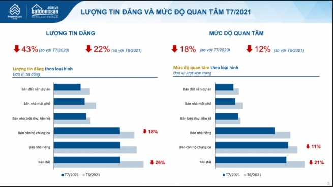 Theo báo cáo của batdongsan.com.vn, tháng 7/2021 chứng kiến số ca nhiễm COVID-19 đạt đỉnh, thị trường bất động sản Việt Nam tiếp tục chịu những tác động tiêu cực, đặc biệt ở các tỉnh miền Nam. Lượng tin đăng toàn trang giảm 22%, trong khi mức độ quan tâm giảm 12% so với tháng trước, giao dịch nhiều nơi giảm 60-70%.