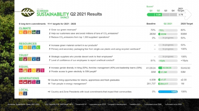 “Một chương trình phát triển bền vững thành công phải được xây dựng trên niềm tin và sự cam kết.” Ông Olivier Blum, Giám đốc Chiến lược và Phát triển bền vững của Schneider Electric chia sẻ. “Thật đáng khích lệ khi thấy được sự huy động cao từ các đối tác chuỗi cung ứng, cũng như khách hàng và nhân viên của tập đoàn trong hành trình giảm lượng phát thải các-bon của chúng tôi – tất cả đều dựa vào chuyên môn và kinh nghiệm chuyên biệt của chúng tôi trong lĩnh vực này”