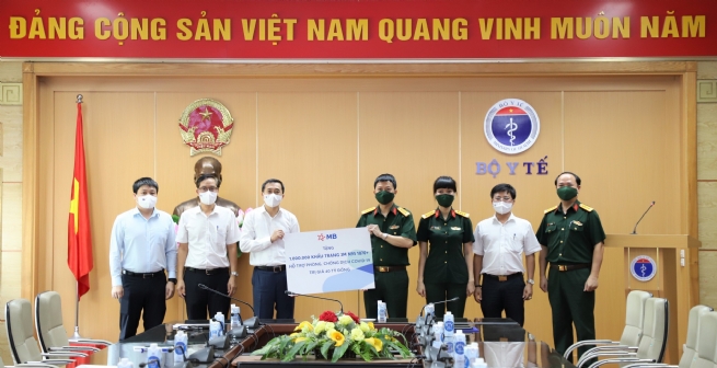 Chiều ngày 06/9/2021, tại Lễ tiếp nhận vật tư y tế hỗ trợ công tác phòng chống dịch COVID-19, Ngân hàng TMCP Quân Đội (MB) đã trao tặng Bộ Y tế 1.000.000 khẩu trang y tế 3M 1870+N95, hỗ trợ lực lượng tuyến đầu phòng, chống dịch và bày tỏ quyết tâm của MB trong việc đồng hành cùng Chính phủ,Bộ Y tế,Bộ Quốc phòng, NHNN, chính quyền Hà Nội, TP. HCM và các tỉnh/thành trên cả nướctrong công tác đẩy lùi dịch bệnh, bảo đảm sức khỏe cho người dân.