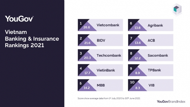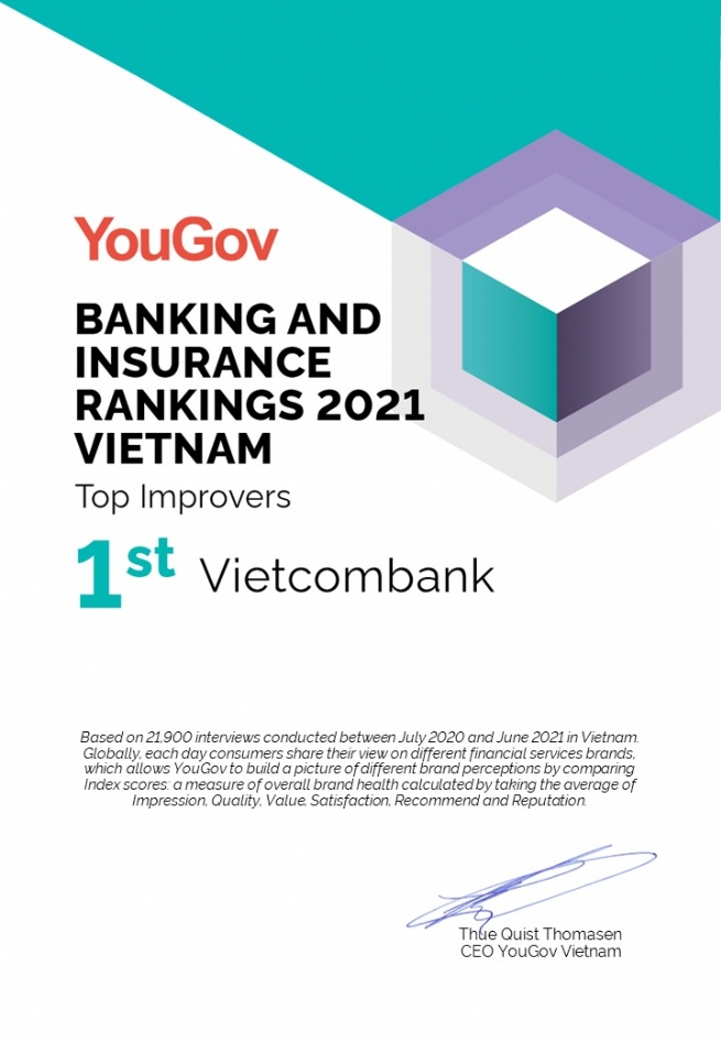 Vietcombank là thương hiệu đứng đầu trong bảng xếp hạng thương hiệu bảo hiểm, ngân hàng Việt Nam năm 2021 (Vietnam Banking & Insurance Rankings 2021). Đây là thông tin được công bố mới đây bởi YouGov - một công ty nghiên cứu và phân tích dữ liệu quốc tế, có trụ sở chính tại Anh và hiện có mặt tại hơn 40 quốc gia. Cũng theo YouGov, tại Bảng xếp hạng riêng các thương hiệu ngân hàng hàng đầu Việt Nam, Vietcombank cũng đứng thứ nhất trong các ngân hàng Việt Nam.