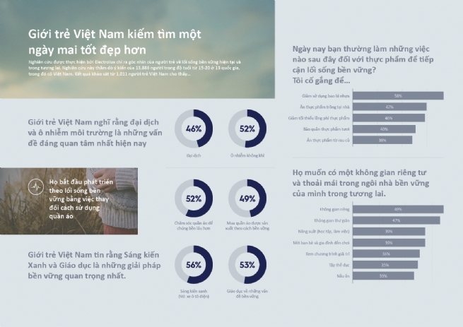 Là một phần trong tầm nhìn và mục tiêu táo bạo năm 2030 của Electrolux về việc xây dựng cuộc sống bền vững và tốt đẹp hơn, công ty đã thực hiện một nghiên cứu lớn nhằm khảo sát quan điểm của giới trẻ về cuộc sống bền vững ở hiện tại và trong tương lai. Nghiên cứu cho thấy có hơn 1,000 người trẻ Việt Nam chủ yếu tin vào bản thân (33%), các nhà khoa học (22%) và những người có ảnh hưởng (19%) có thể làm chủ sự thay đổi để hướng tới một tương lai bền vững, trong khi chỉ 8% người trẻ tin rằng thế hệ trước sẽ đảm nhận nhiệm vụ này. Khoảng sáu trên mười người trẻ (63%) cũng tin rằng họ sẽ thực sự giải quyết được khủng hoảng khí hậu.