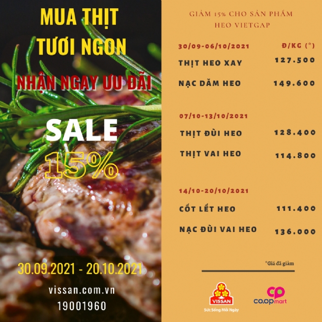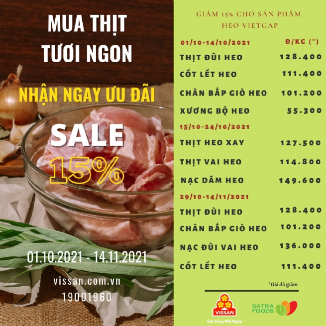 Theo đó, công ty VISSAN giảm giá lên đến 15% các mặt hàng Thịt Heo VietGAP như: Ba rọi heo rút sườn, Sườn non, Cốt lết heo, Nạc dăm heo... Ngoài ra còn ưu đãi 40% đối với mặt hàng đầu lòng heo như tim heo, lưỡi heo,…
