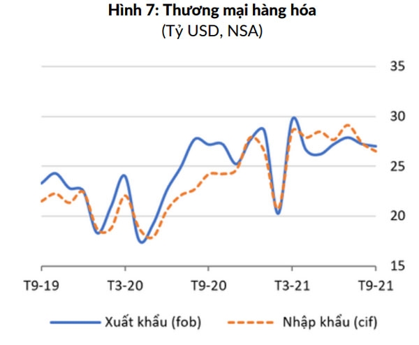 Với xuất khẩu phụ thuộc nhiều vào đầu vào nhập khẩu và nhu cầu trong nước còn yếu, việc nhập khẩu vẫn tăng trong tháng 9 có thể chủ yếu xuất phát từ giá nhập khẩu tăng cao, tăng đến 9,5% (so cùng kỳ năm trước) trong quý III/2021, do giá hàng hóa thế giới tăng vọt và các chuỗi cung ứng toàn cầu bị gián đoạn.