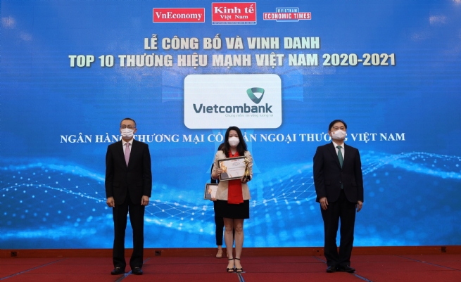 Đại diện Vietcombank (ở giữa) nhận giải thưởng Top 10 Thương hiệu mạnh Việt Nam năm 2020-2021