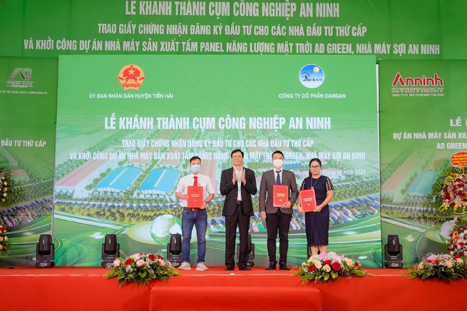 Trong đó, Công ty Cổ phần Tập đoàn năng lượng xanh AD đầu tư xây dựng nhà máy trên diện tích diện tích 7.9ha với sản phẩm chủ lực là tấm panel năng lượng mặt trời công suất 1,8 triệu sản phẩm/năm. Đây là sản phẩm chứa đựng công nghệ tiên tiến nhất trên thế giới về chuyển đổi quang năng thành điện năng, với dây chuyền sản xuất đồng bộ hiện đại và tự động hoá 100%. Thành phẩm đạt chứng nhận và tiêu chuẩn quốc tế được thừa nhận và đủ điều kiện cung cấp cho những thị trường khó tính nhất như: Mỹ, Nhật Bản, châu Âu... Sau khi nhà máy đi vào hoạt động, Công ty Cổ phần Tập đoàn năng lượng xanh AD sẽ tiếp tục đầu tư và đưa vào sản xuất các sản phẩm ứng dụng từ tấm panel như đèn năng lượng mặt trời…