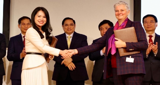 Bà Nguyễn Thị Thanh Bình, Phó Tổng Giám đốc Tập đoàn T&T Group, và đại diện Tập đoàn Total Eren (Cộng hòa Pháp) trao biên bản ghi nhớ hợp tác trong lĩnh vực năng lượng tái tạo, với sự chứng kiến của Thủ tướng Phạm Minh Chính