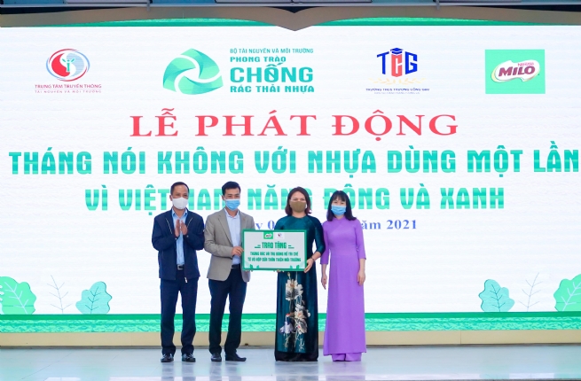 Trung tâm Truyền thông Tài nguyên và Môi trường và Nestlé MILO trao thùng rác và trụ bóng rổ tái chế từ vỏ hộp sữa thân thiện môi trường cho trường tiểu học tại Hà Nội.