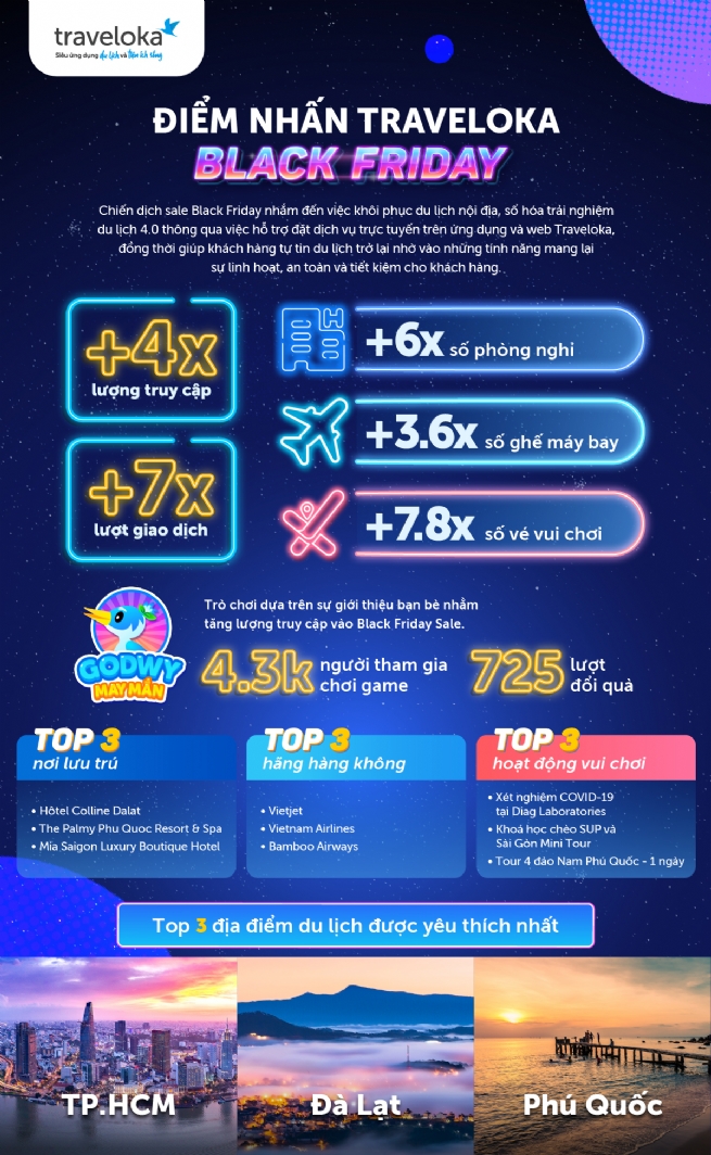 Diễn ra từ ngày 24 đến 30/11 với sự tham gia của hơn 750 đối tác trong lĩnh vực du lịch, chiến dịch Black Friday của Traveloka đã chứng kiến lượt giao dịch tăng hơn 7 lần. Bên cạnh đó, thông qua những ưu đãi hấp dẫn lên đến 50% cho các dịch vụ du lịch và tiện ích sống, Traveloka mong muốn mang đến cho người dùng những trải nghiệm du lịch trọn vẹn nhất trong dịp lễ hội cuối năm với mức phí hợp lý. Những số liệu ấn tượng từ chiến dịch thể hiện đóng góp của Traveloka trong việc kích cầu du lịch, và được kỳ vọng sẽ mang lại tín hiệu tích cực cho hoạt động kinh doanh của đối tác. Đồng thời, Traveloka tiếp tục cam kết lâu dài trong việc hỗ trợ sự phát triển của hệ sinh thái du lịch trong nước, bên cạnh đảm bảo du lịch an toàn qua việc khuyến khích khách hàng và đối tác tuân thủ chặt chẽ các quy định về sức khỏe.