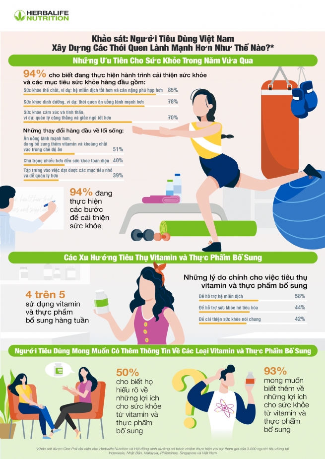 Một cuộc khảo sát mới về việc sử dụng thực phẩm bổ sung dinh dưỡng ở khu vực Châu Á Thái Bình Dương cho thấy có đến 94% người tiêu dùng tại Việt Nam tin rằng để có sức khỏe tốt là một hành trình và 94% đang thực hiện các bước để cải thiện sức khỏe trong năm qua.