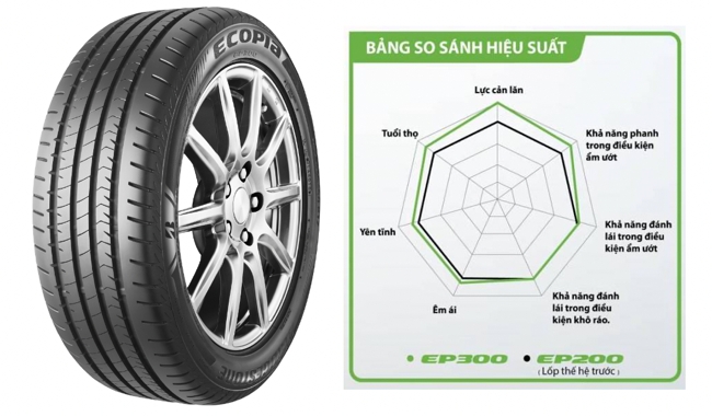 Bảng so sánh hiệu suất giữa ECOPIA EP300 và EP200 (lốp xe thế hệ trước) với những cải tiến vượt trội