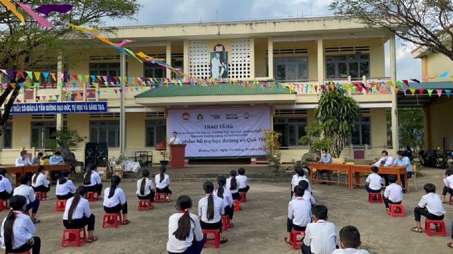Cũng tại lễ trao nhận, các vật phẩm hỗ trợ học đường bao gồm dụng cụ học tập, áo mưa, cồn rửa tay, khẩu trang và các Gói quà tết (được cung cấp bởi đơn vị đồng hành chuỗi siêu thị MM Mega Market Việt Nam) cũng được UBMTTQ 3 tỉnh và VietBev trao cho đại diện 15 trường học, nhằm hỗ trợ các em một năm học đầy đủ và an toàn. Chương trình được thực hiện với sự phối hợp, đóng góp của VietBev, công ty Thai Beverage Public Company Limited (ThaiBev), Công ty C-Asean và Quỹ Sirivadhanabhakdi.