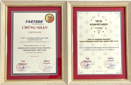 Ngày 22/4/2022, Công ty Bảo hiểm Nhân thọ Dai-ichi Việt Nam (Dai-ichi Life Việt Nam) đã vinh dự đứng trong Bảng xếp hạng FAST500 - Top 500 Doanh nghiệp tăng trưởng nhanh nhất Việt Nam - năm 2022, đồng thời được tôn vinh trong Top 50 Doanh nghiệp tăng trưởng xuất sắc nhất Việt Nam (Top 50 Vietnam Best Growth) - năm 2022.