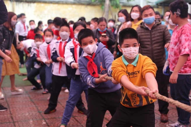 Các em học sinh tham gia thi Kéo co và Nhảy bao bố