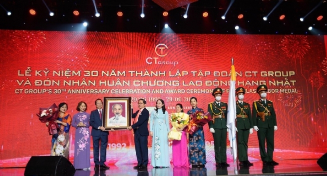 Đại diện Ban lãnh đạo CT Group đón nhận Huân chương Lao động hạng Nhất do Phó Chủ tịch nước Võ Thị Ánh Xuân, thừa ủy quyền của Chủ tịch nước, trao tặng cho tập thể doanh nghiệp và Huân chương Lao động hạng Nhì cho cá nhân ông Trần Kim Chung - Chủ tịch Tập đoàn CT Group