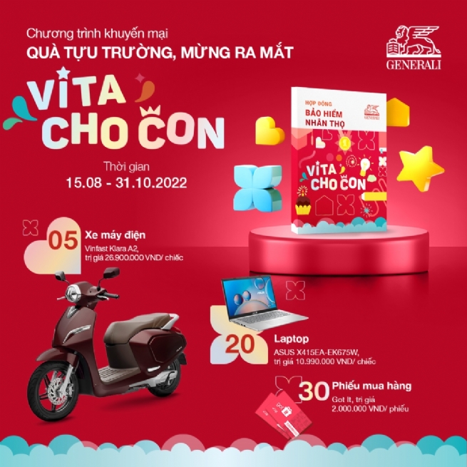 Generali đang triển khai chương trình khuyến mại “Quà tựu trường, mừng ra mắt VITA – Cho Con” với nhiều quà tặng hấp dẫn cho các phụ huynh tham gia sản phẩm