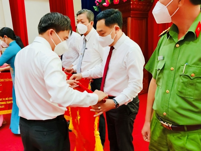 Phó Chủ tịch UBND tỉnh Tiền Giang Nguyễn Văn Mười trao tặng Cờ thi đua cho ông Võ Khánh Bình - Giám đốc BHXH Tiền Giang