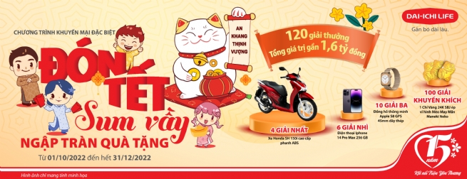 Tiếp nối chuỗi các chương trình tri ân khách hàng hấp dẫn, sôi động nhân dịp chào mừng 15 năm thành lập Dai-ichi Life Việt Nam (18/01/2007 - 18/01/2022), đồng thời đánh dấu mốc son kỷ niệm 120 năm thành lập Tập đoàn Dai-ichi Life (15/09/1902 - 15/09/2022), Dai-ichi Life Việt Nam triển khai chương trình khuyến mại đặc biệt trong Quý 4/2022 - “Đón Tết Sum Vầy, Ngập Tràn Quà Tặng” - dành cho Khách hàng từ ngày 01/10/2022 đến hết ngày 31/12/2022.