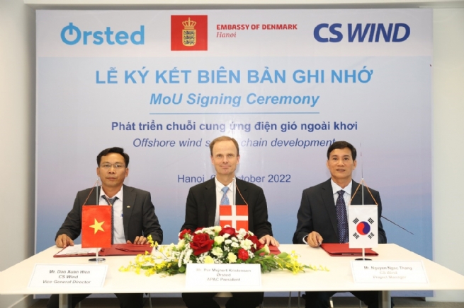 Tiến thêm một bước hướng tới việc khởi động thành công ngành công nghiệp nội địa mới nhằm hỗ trợ mục tiêu phát thải ròng bằng 0 vào năm 2050 của Việt Nam, Tập đoàn Ørsted và CS Wind Việt Nam đã ký kết Biên bản ghi nhớ vào ngày 06 tháng 10, đặt mục tiêu hợp tác trong việc phát triển chuỗi cung ứng điện gió ngoài khơi tại Việt Nam, bao gồm nhưng không giới hạn các phạm vi về tháp gió, kết cấu phần móng ngoài khơi, chế tạo thép,...