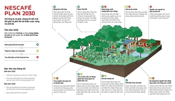 Nestlé vừa công bố kế hoạch NESCAFÉ Plan 2030 mở rộng với mục tiêu hướng đến canh tác bền vững, phối hợp giúp nông dân chuyển đổi sang nền nông nghiệp tái sinh, giảm phát thải khí nhà kính.