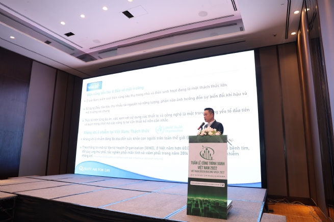 Theo thống kê của của Tổ chức Y tế thế giới (WHO), trong số 10 bệnh có tỷ lệ tử vong cao nhất ở Việt Nam thì 6 bệnh liên quan đến đường hô hấp có nguyên nhân từ ô nhiễm không khí và chất lượng không khí. Trong khi đó, phần lớn hoạt động của con người được diễn ra trong các tòa nhà; chất lượng không khí trong nhà chính là một trong các yếu tố ảnh hưởng lớn đến sức khỏe con người. Tháng vừa qua, Bộ Khoa học và Công nghệ cũng ban hành tiêu chuẩn quốc gia TCVN 13521:2022 về Nhà ở và nhà công cộng – Các thông số chất lượng không khí trong nhà, quy định giới hạn các thông số chất lượng không khí trong nhà như bụi mịn, vi khuẩn, vi rút, thông gió tòa nhà… Tiêu chuẩn này không chỉ đóng vai trò trong việc đánh giá hệ thống thiết bị thông gió – điều hòa không khí của tòa nhà mà là còn là cơ sở để đo lường chất lượng môi trường trong nhà đối với các công trình xanh.