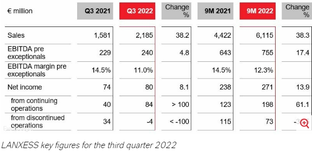 Trong quý 3/2022, LANXESS ghi nhận 84 triệu EUR thu nhập ròng từ các hoạt động liên tục, so với 40 triệu EUR cùng kỳ năm trước.