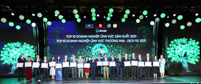 Ông Nguyễn Văn Thắng – Chủ tịch HĐTV Tổng Công ty Cao su Đồng Nai (thứ 4 từ trái sang) nhận chứng nhận Top 10 Doanh nghiệp sản xuất phát triển bền vững năm 2021
