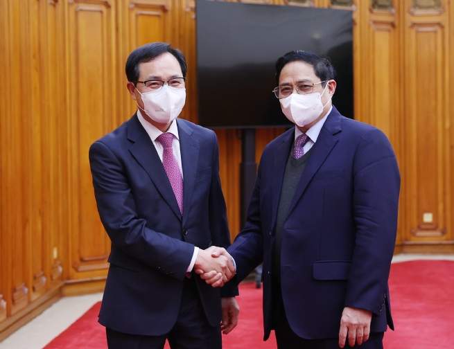 Ông Choi Joo Ho (bên trái), Tổng giám đốc Samsung Việt Nam tiếp kiến Thủ tướng Phạm Minh Chính