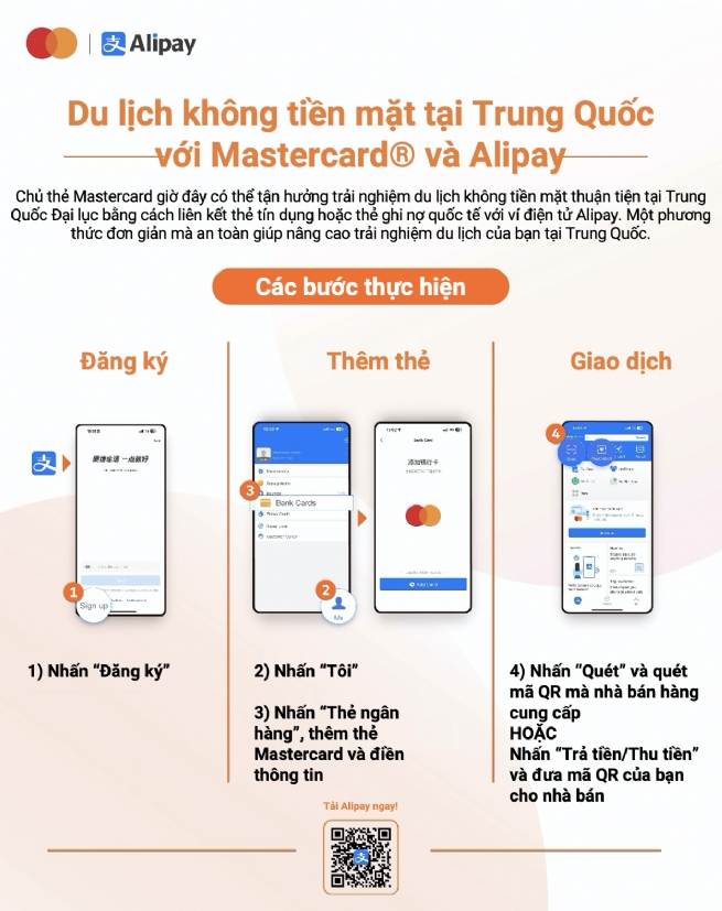 Bằng cách lựa chọn thanh toán không dùng tiền mặt trên thiết bị di động tại hàng chục triệu điểm chấp nhận Alipay trên toàn quốc với mã QR là hình thức thanh toán phổ biến nhất, chủ thẻ Mastercard ở khắp nơi trên thế giới có thể giao dịch dễ dàng và thuận tiện khi ở Trung Quốc, giống như người bản xứ.