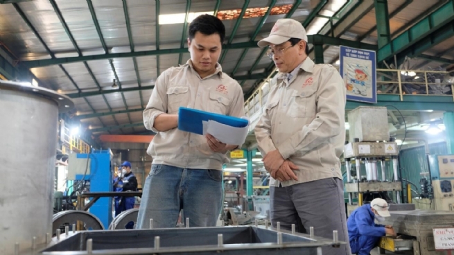 Ông Lê Quý Khả, Chủ tịch Hội đồng quản trị của TOMECO An Khang (bên phải), trao đổi với Trưởng phòng Cải tiến Liên tục về việc ứng dụng mã vạch và truy xuất nguồn gốc. Ảnh: Trần Lương Thái, TOMECO An Khang