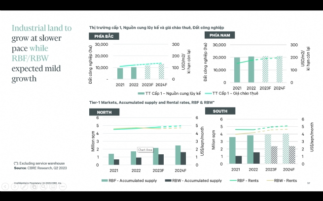 Cụ thể, nửa đầu năm 2023 với tỷ lệ hấp thụ ghi nhận khả quan ở cả đất công nghiệp, nhà xưởng và nhà kho xây sẵn (RBF và RBW) cả miền Bắc và miền Nam.